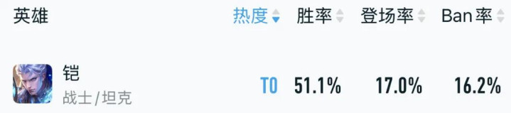 最近这段时间铠的胜率突然大涨,胜率来到了51.1%,登场率17%成为对抗路的唯一T0战士